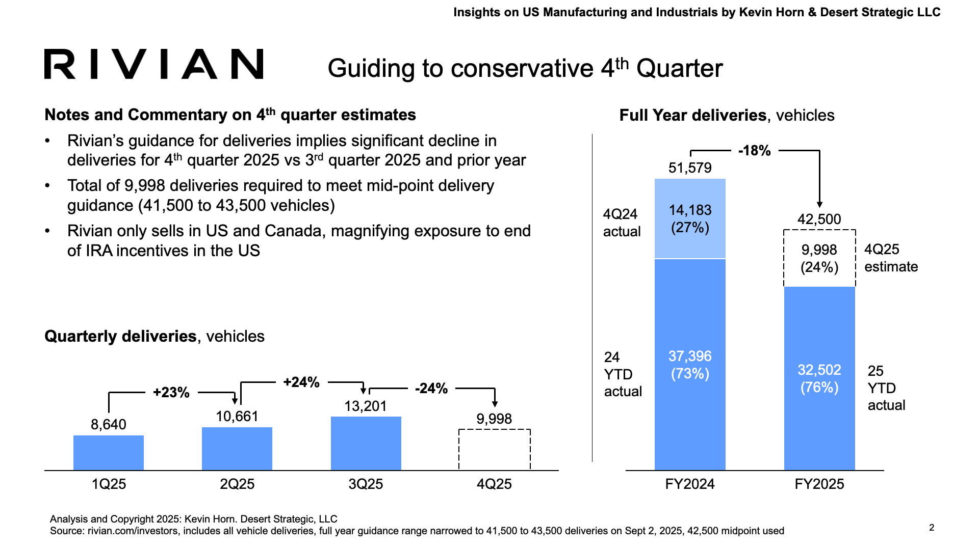 At a significantly smaller scale than Tesla, Rivian has been more cautious in its delivery forecasts. They recently reaffirmed and narrowed their 2025 full year estimates on October 2nd, 2025 when they announced 3rd quarter production and delivery totals. Distinctly different from Tesla, however, is that many of Rivian’s vehicles would also have had limited or no eligibility for IRA subsidies due to MSRPs above $80,000 cap and historically not meeting domestic sourcing requirements. While this will may limit the impact of losing subsidies, Rivian still forecasts significantly reduced 4th quarter and full-year deliveries, down 24% from 3rd quarter and 18% year-over-year.